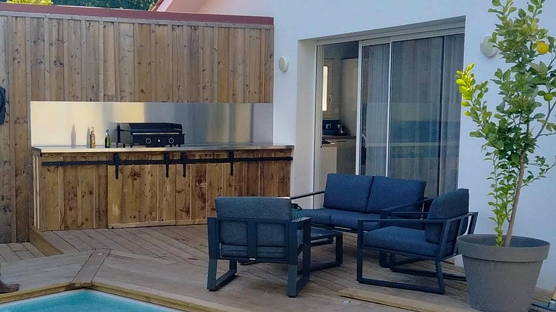 Cuisine d'été plan de travail et crédence en inox.