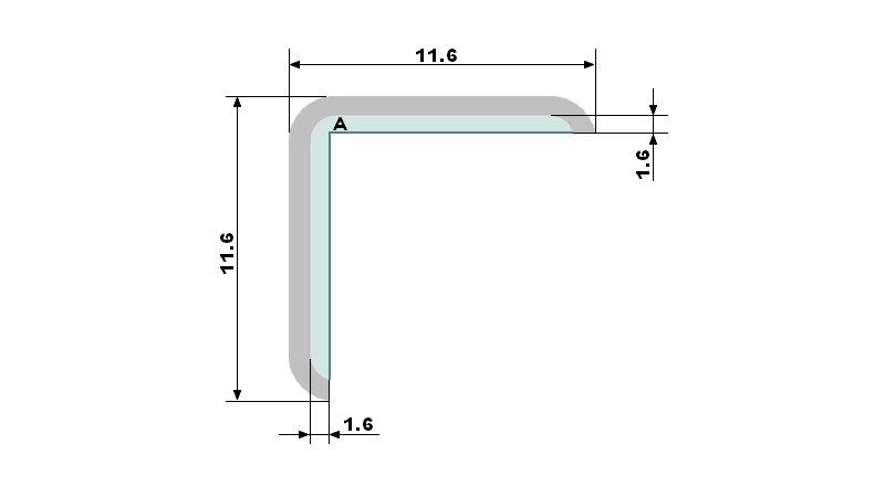 a les bords arrondis. La partie creuse (A) de 1.6 mm permet de loger soit une bande de mousse adhésive, soit des petits plots de colle en tube. Et permet aussi de positionner la cornière parfaitement contre le mur, même si l'angle des murs ne fait par parfaitement 90°. Ce qui n'est pas le cas avec une simple cornière pliée à 90°.
