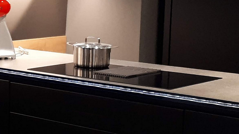 La hotte est directement intégrée à la plaque de cuisson, les fumées sont aspirées par le côté des plats. Cela permet d'insérer une plaque de cuisson dans un ilôt central sans avoir besoin d'accrocher une hotte au plafond. L'effet visuel est bien meilleur. Lorsque l'on est contre un mur, cela permet aussi de disposer d'éléments hauts supplémentaires.