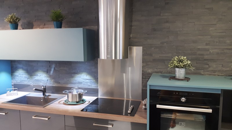 Sur la photo ci dessous, on remarque que la hauteur de la hotte est plus basse que celle de la crédence. Pour autant, le cuisiniste a bien respecté les règles puisque la hotte est posée assez bas (plus bas que la crédence standard 60 x 70 centimètres) pour capter malgré tout les vapeurs ou fumées.