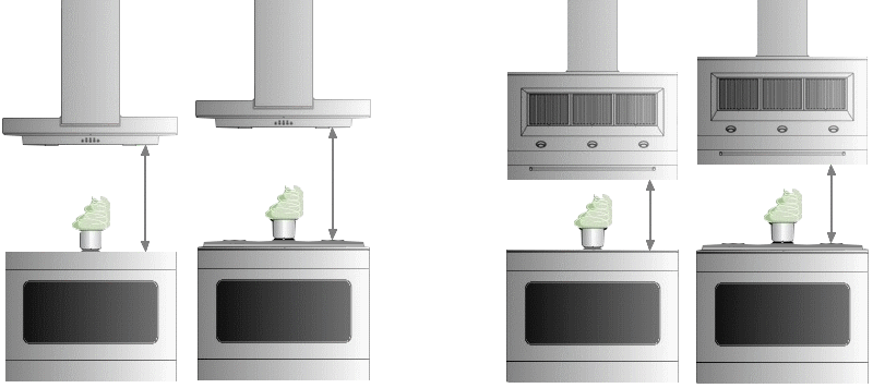 La référence réelle à prendre en compte devrait être le haut du récipient. Néanmoins, les cocotes ou casseroles sont de hauteur différente. Des études ont été faites par les fabricants de hotte et la référence est la base de la casserole. Donc, la hauteur de la hotte pour une plaque électrique se mesure à partir du plan de travail. En ce qui concerne les plaques gaz, il y a souvent des grilles en fonte qui modifient sensiblement le niveau des casseroles. Souvent 3 à 5 centimètres sont nécessaires pour laisser passer la chaleur. La hauteur pour positionner la hotte devra donc être 3 à 5 centimètres plus haut lorsque l'on a une plaque gaz. C'est pour cette raison que les crédences standard ont des hauteurs qui varient de 5 en 5 centimètres. 40, 45, 50 centimètres (hauteur d'une hotte inclinée). 65 , 70 ou 75 centimètres pour une hotte classique.