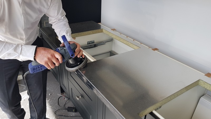 Mise en place du plan de travail et pose des éléments plaque et cuve.