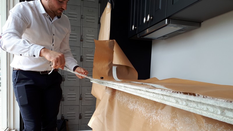 La pose du chant est très facile avec la colle utilisée. Le collage est instantané. Pour les bandes de chant avec led, il faut bien centrer le chant sur le plan de travail.