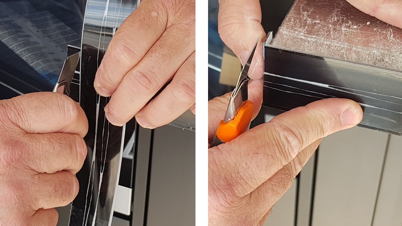 Pour couper net le chant, il faut faire un trait de cutter sur le chant, puis le plier, il va casser net.