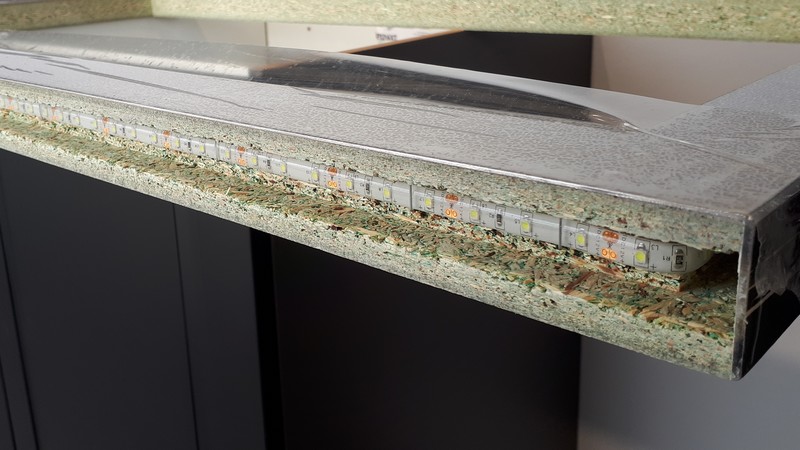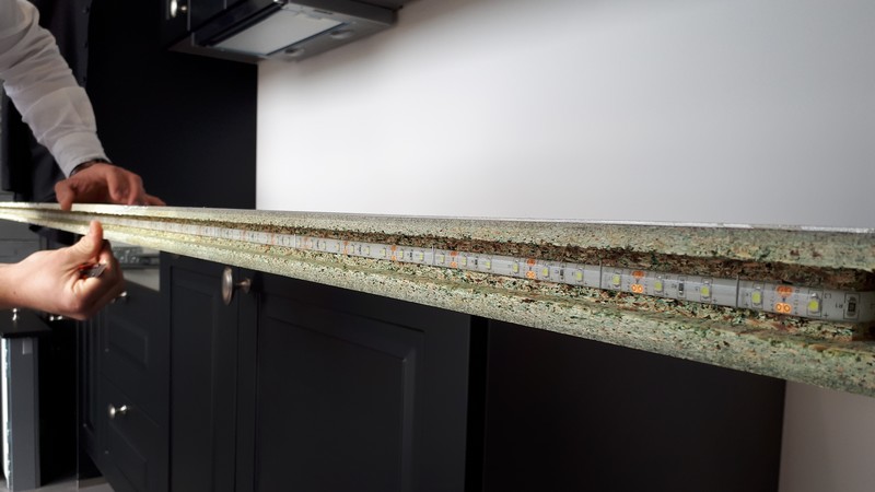 Le chant du plan de travail doit avoir une surface parfaitement plane. Il est important de bien vérifier l'état de cette surface avant de coller la bande de chant sur le plan de travail. La rainure que l'on voit sur le chant de ce plan intègre de leds pour un chant lumineux intégré.