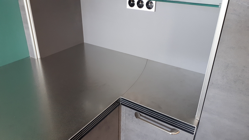 Crédence inox innove encore. Afin de permettre l'alignement le long des murs qui ne sont pas toujours à angle droit, nous avons développé un assemblage d'angle qui permet une rotation des plans de travail l'un par rapport à l'autre. Au lieu de couper de façon rectiligne le plan, nous avons opté pour une coupe arrondie. Cette coupe permet un réglage de plus ou moins 3 degrés sans avoir à recouper le plan. La pose est donc très facile. Ce produit est réservé à la gamme professionnelle. la coupe droite est disponible dans la gamme pour particuliers.