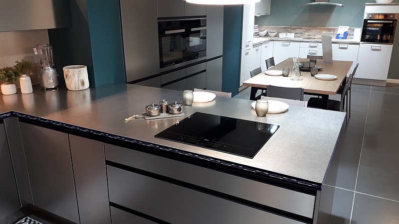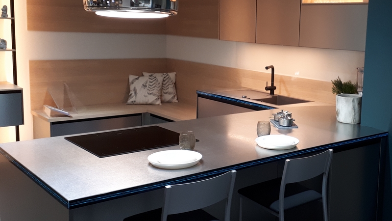 Ixina Montélimar marie le plan de travail inox cuir avec éclairage par leds couleur et les façades inox de la marque IXINA. La démonstration est moderne, contemporaine et les inox s'accordent parfaitement. Le mur est peint avec un bleu 'canard' qui réchauffe l'ambiance de l'ensemble. Les crédences sont en bois blond et le mobilier de cuisine est en inox. L'ensemble est moderne et efficace. Les chants du plan de travail noirs laissent passer un éclairage par leds incrustées. Cet éclairage led permet de régler les couleurs. Ici, il est éclairé en blanc.