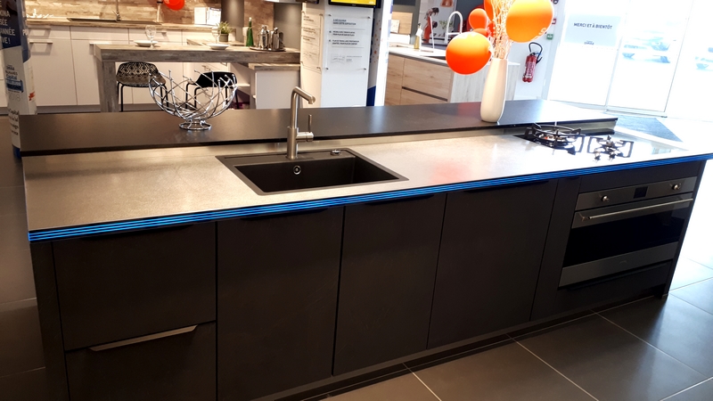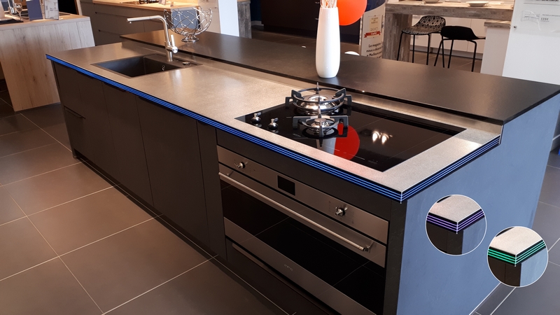 L'îlot central est décomposé en deux parties. La partie comptoir est réalisée avec un plan de travail en stratifié noir. L'espace travail est réalisé avec un plan inox cuir orné d'un chant lumineux 3 bandes. Les plaque de cuisson et cuve sont posées à fleur de plan, ce qui permet de faire glisser les plats directement de la plaque de cuisson sur le plan. L'inox résistera à la chaleur ce qui est un avantage par rapport aux plans stratifiés.