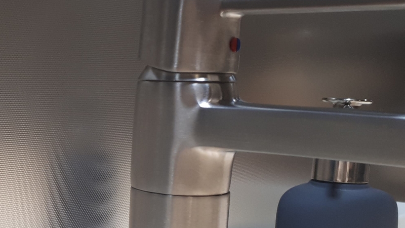 La crédence en inox structuré est une nouveauté de la gamme Crédence inox. Cette nouveauté est accessible dans certaines versions de la gamme PRO. La crédence a un aspect robuste et très design. Elle est très chic, et se confond très bien dans les cuisines de luxe. Ici, notre cuisiniste l'a intégrée dans une de ses plus belles expositions. Son atout, un prix raisonnable, une robustesse à toute épreuve, et un design incomparable. Entre mat et brillant, cette imitation de tissu sur une base inox est aussi à l'aise dans un décor contemporain, que classique, voire ancien. La photo ci après montre quelques détails.