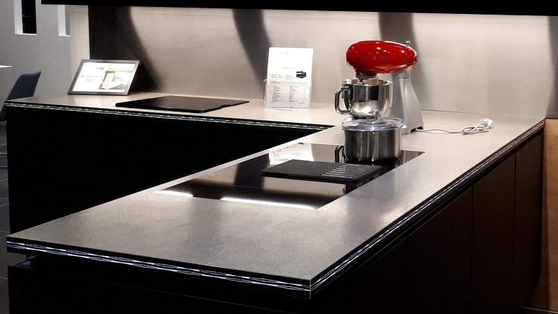 Pour cette exposition, Notre cuisiniste n'a pas fait à moitié. Le plan de travail est en inox cuir, très résistant. Un des meilleurs plans de travail actuellement. Il n'a pas oublié de présenter l'option avec éclairage par led intégrées dans les chants. Ce plan de travail intègre à fleur de plan, l'évier, ou plutôt la cuve avec robinet à encastrement automatique. Eh oui, le robinet sort lorsque vous demandez de l'eau et rentre automatiquement lorsque vous coupez l'eau... Plus une plaque de cuisson très haut de gamme de la marque « NIKOLATESLA » avec aspiration par hotte intégrée posée elle aussi à fleur de plan. Ce cuisiniste, qui propose des cuisines haut de gamme, sait aussi proposer de belles cuisines à un tarif raisonnable.