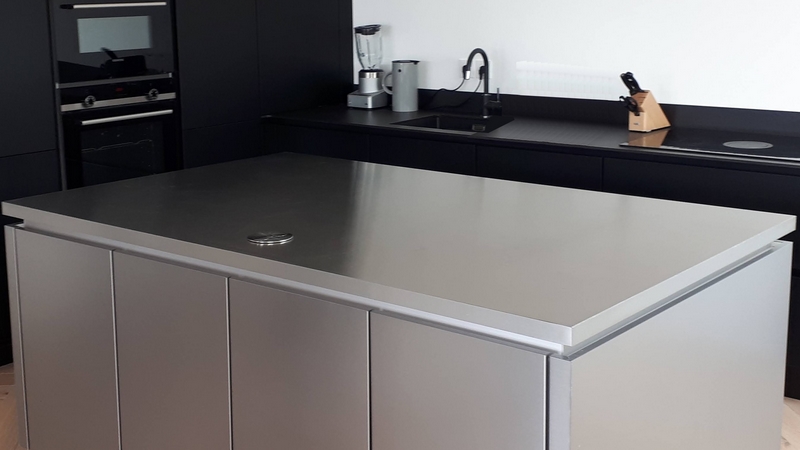 Ici, on opte pour un ilot 100% inox. Résolument moderne, épuré, l’ilot central inox s’adapte à toutes les ambiances. Les façades de porte en inox de l’ilot central se conjuguent très bien avec le mobilier noir de la cuisine. Quelle que soit la composition de votre cuisine, un ilot, une table murale en inox se mariera avec toutes les ambiances. Vous pourrez jouer avec tous les styles. Un bois blond qui illumine la pièce, un bois foncé la rendra plus raffinée. Des façades laquées, avec leur aspect brillant sont également monnaie courante dans une cuisine design.