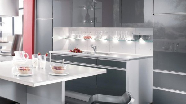 Une large étagère en verre dotée de Leds se profile sur la crédence pour la sublimer et illuminer le plan de travail.
