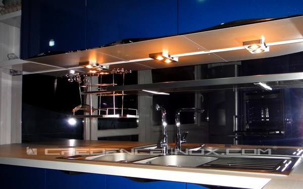 Posé l'air de rien sur un côté du plan de travail, un spot, bien orienté, devient une idéale source de lumière démultipliée par la brillance de la crédence en inox !