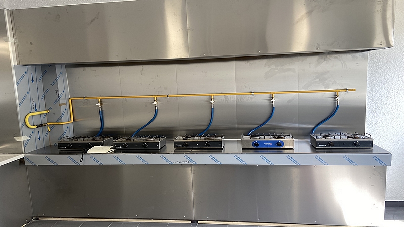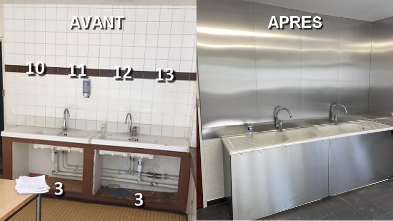 Chaque pièce est positionnée dans le colis dans un ordre bien défini. La colle et autres systèmes de fixation sont compris. La pose est facilitée au maximum. Les plaques d'inox mural sont doublées d'un aggloméré hydrofuge. Chaque bord visible est fini par un pliage de l'inox dont la dimension permet de masquer le support aggloméré plus l'épaisseur du carrelage recouvert. Cette finition appelée spéciale faïence évite de déposer les faïences et refaire chaque mur
