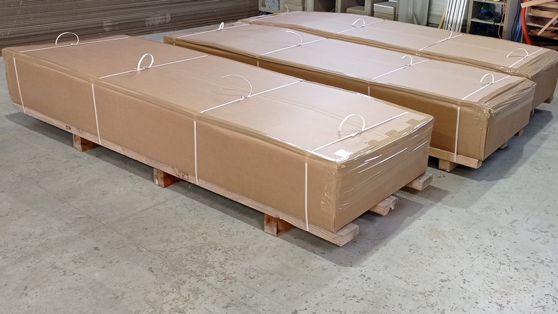 Le batiment comporte 11 étages, donc 11 cuisines identiques. Enfin pas vraiment identiques... Eh oui, les maçons et autres plaquistes ne travaillent pas au centième de millimètre. Donc chaque cuisine est différente. La photo ci dessous montre notre conditionnement, 1 colis par étage. Dans chaque colis, chaque pièce est repérée suivant les repères définis lors du devis.