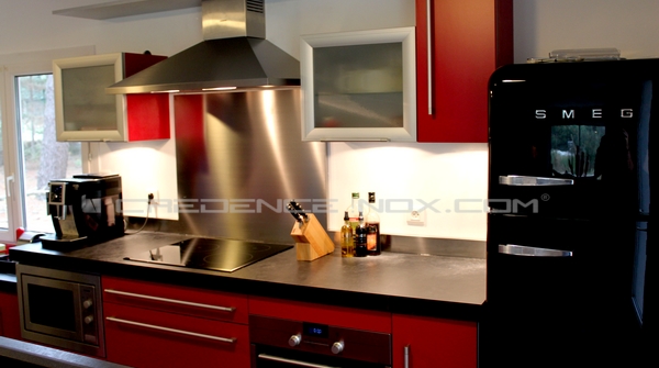 Dans ce premier exemple, la crédence renforce le coté brut de la hotte inox tout en soulignant le piano de cuisson.