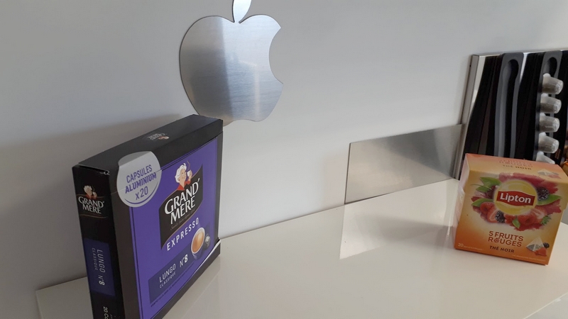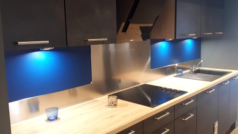 Ici, la crédence dans le show room d'un cuisiniste recouvre une ancienne crédence en verre qui était cassée.