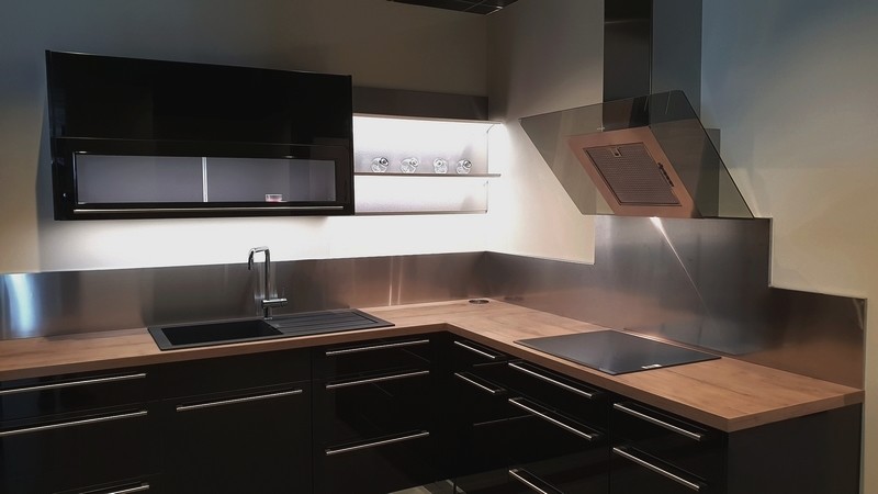 Une cuisine parfaitement équilibrée, les crédences sont dans aucun raccord, le visuel est agréable, l'inox se marie parfaitement avec les matières bois, noir, blanc... Il est évident que l'entretien de cette crédence se fera d'un coup de microfibre. Et Hop ! N'hésitez pas à utiliser nos produits d'entretien. Certes, plus chers que ceux que vous trouvez dans le commerce, nous vous garantissons leur qualité et ils durent longtemps.
