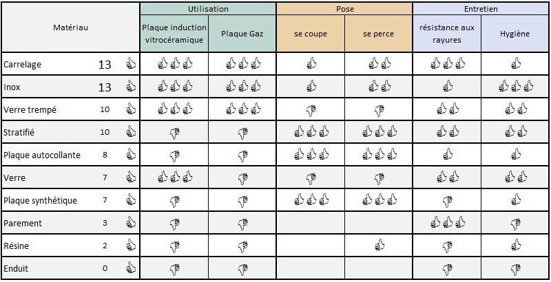 Ce tableau ne doit vous servir que de guide pour ne pas effectuer d'erreur dans votre choix. Il ne peut tenir compte des goûts de chacun. Nous espérons vous avoir influencé vers nos produits, bien entendu, mais surtout vous avoir éclairé dans vos choix. Que l'inox arrive en seconde position n'est pas un hasard, effectivement, l'inox est parfaitement compatible avec tous les systèmes de cuisson, l'inox se coupe maintenant assez facilement avec des disques pour inox, se perce facilement avec une mèche à métaux neuve sans tourner trop vite. La résistance de l'inox aux rayures est bonne en crédence et pour ce qui est de l'hygiène, sa réputation est faite.