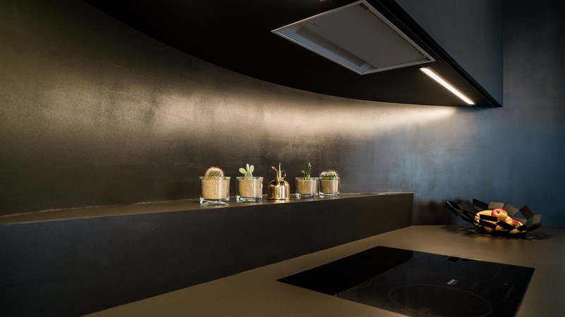 Sur la photo ci-dessus, on voit dans l'angle de la cuisine une descente de canalisation qui fait un angle sortant. La finition d'un tel angle est toujours difficile à réaliser proprement. Nos techniciens ont développé un procédé de pliage qui permet de réaliser ceci d'une seule pièce sans raccord. Côté design, le résultat est parfait, et côté hygiène, rien à redire.